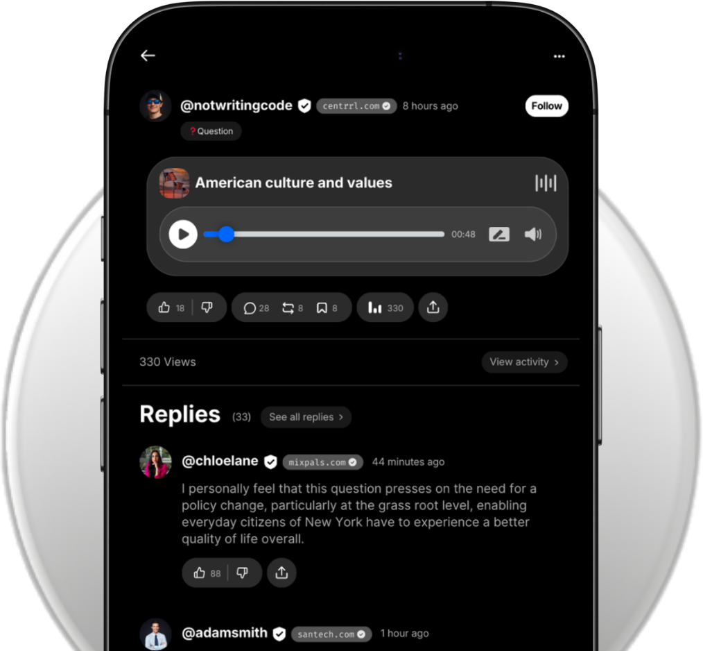Centrrl is designed so that people communicate and express their thoughts in their natural voice. Just real, honest, thoughtful, and authentic conversation — that’s what a public square should be.